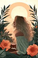 Dit trendy kunstwerk toont een vrouwelijke figuur gezien vanaf de rug, zittend tussen weelderige groene planten en bloeiende bloemen.