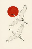 Twee sierlijke kraanvogels zweven omhoog langs een helderrode zon, minimalistisch en krachtig weergegeven op een zachte, crèmekleurige achtergrond. Deze tekening ademt de eenvoud en sereniteit van traditionele Japanse kunst.