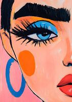 Dit kunstwerk toont een fragment van een gezicht, waarin het oog centraal staat. De blik is direct en gericht, omlijst met een brede wenkbrauw en zware wimpers. Het ooglid is gevuld met een vlak blauw, omringd door een rand geel. Op de wang is een oranje ovaalvorm aangebracht, die visueel in balans staat met de blauwe oorring aan de linkerkant van het beeld. De mond is gedeeltelijk zichtbaar, met rode lippen die een subtiele curve tonen.