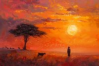Een Samburu-herder ervaart het eerste contact terwijl hij van onder een eenzame boom toekijkt hoe een gigantische monoliet in de verte de zon bedekt. Zijn kuddes vee raken angstig. Ruwe pastelkunst met eenvoudige lijnen, zonsondergangtinten, en een surrealistische sfeer vangen dit magische moment perfect.