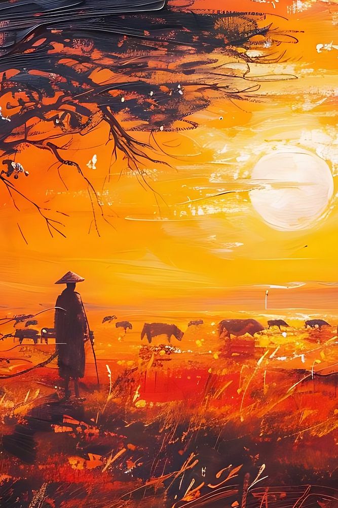 Een Samburu-herder ervaart het eerste contact terwijl hij van onder een eenzame boom toekijkt hoe een gigantische monoliet in de verte de zon bedekt. Zijn kuddes vee raken angstig. Ruwe pastelkunst met eenvoudige lijnen, zonsondergangtinten, en een surrealistische sfeer vangen dit magische moment perfect.