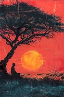 Een Samburu-herder ervaart het eerste contact terwijl hij van onder een eenzame boom toekijkt hoe een gigantische monoliet in de verte de zon bedekt. Zijn kuddes vee raken angstig. Ruwe pastelkunst met eenvoudige lijnen, zonsondergangtinten, en een surrealistische sfeer vangen dit magische moment perfect.