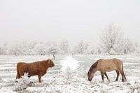 Op een prachtige winter ochtend staan een Schotse Hooglander en een Konikpaard tegenover elkaar in een wit landschap in het Nationaal park Lauwersmeer in Groningen.