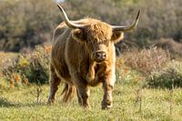 Een Schotse hooglander met een paar mooie hoorns staand in de Nederlandse Duinen om te zorgen voor een goede natuurlijke begrazing van het duin.
