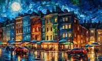 Het kleurrijke palet dat ik heb gekozen, varieert van de diepblauwe tinten van de hemel tot de levendige oranjes, roods en groens van de stadsgebouwen. De kubistische fragmenten in de lucht zijn geïnspireerd op de dynamische penseelstreken die Van Gogh gebruikte. De reflecties op de natte straatstenen geven diepte aan het tafereel en trekken de toeschouwer erin.