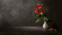 In dit verfijnde stilleven staat een elegante rode Aziatische lelie centraal, geplaatst in een minimalistische vaas. Het zachte licht dat door een raam naar binnen valt, benadrukt de rijke kleuren en de delicate textuur van de bloemblaadjes. De levendige tinten rood contrasteren prachtig met de rustige, donkere achtergrond, waardoor de bloem bijna tot leven lijkt te komen.