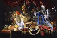 Een Taart op een Tinnen Plaat, een Gedeeltelijk gepelde Citroen, Een Zilveren Lepel op een Tinnen Plaat, Rivierkreeften en Garnalen in een Wanli Kraak Porselein Bowl. Jan Davidsz. de Heem (1606-1684).