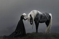 Een mystiek tafereel van een ontmoeting tussen mens en dier, gehuld in de kalme sluier van de ochtendmist. In dit werk raakt een vrouw van middelbare leeftijd het krachtige hoofd van een majestueus barok paard aan—een dier met een diepe, donkere vacht en opvallende lichte manen die glanzen in de zachte mist.