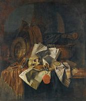 Een vanitas-stilleven met een schedel, een schild, een uurglas, boeken en papieren op een tafelblad, Franciscus Gijsbrechts Franciscus Gijsbrechts, was een Vlaamse schilder van stillevens, gespecialiseerd in vanitas-stillevens en trompe-l'œil-schilderijen. Hij werkte in de tweede helft van de zeventiende eeuw in de Spaanse Nederlanden, Denemarken en de Republiek der Nederlanden. Net als zijn vader schilderde hij trompe-l'œil-stillevens, een stillevengenre waarbij met illusionistische middelen de indruk wordt gewekt dat de geschilderde, tweedimensionale compositie in werkelijkheid een driedimensionaal, echt object is.