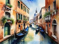 Een digitaal schilderij geïnspireerd op de zonnige straten in Venetië, die niet bestaan uit stenen, maar uit water. Typische Italiaanse huizen die grenzen aan het water en bootjes voor de deuren. In de verte een brug en de toren van één van de vele kerken.