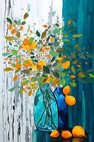 Een met zorg geschilderde blauwe vaas staat trots op de voorgrond, gevuld met levendige groene takken die prachtige gele bloemen dragen. Aan de voet van de vaas liggen rijpe citroenen, die qua kleur perfect samensmelten met de bloemen. De compositie straalt inspirerende sereniteit uit, waarbij de levendige kleuren en de harmonieuze plaatsing een rustige energie oproepen.