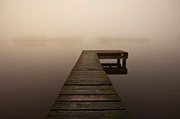 Een houten aanlegsteiger in de mist aan het Paterswoldsemeer, Nederland.