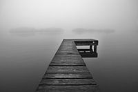Een houten aanlegsteiger in de mist aan het Paterswoldsemeer, Nederland.