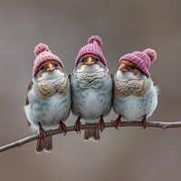 een drietal van huis muisjes grijs bruin oranje van kleur veertjes met een wollen roze mutsje op zittend op een tak.
