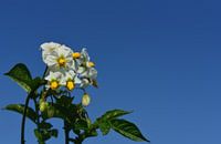 Voor een blauwe hemel groeit een aardappelplant met witte bloemen...