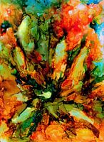 Met een nieuw medium aan de slag gegaan, experimenteren met alcohol inkt. Het is een verrassing wat er uitkomt als de inkten door elkaar lopen. Hier is het plant geworden die met zijn open bladeren de zon probeert te grijpen in het herfstige bos.