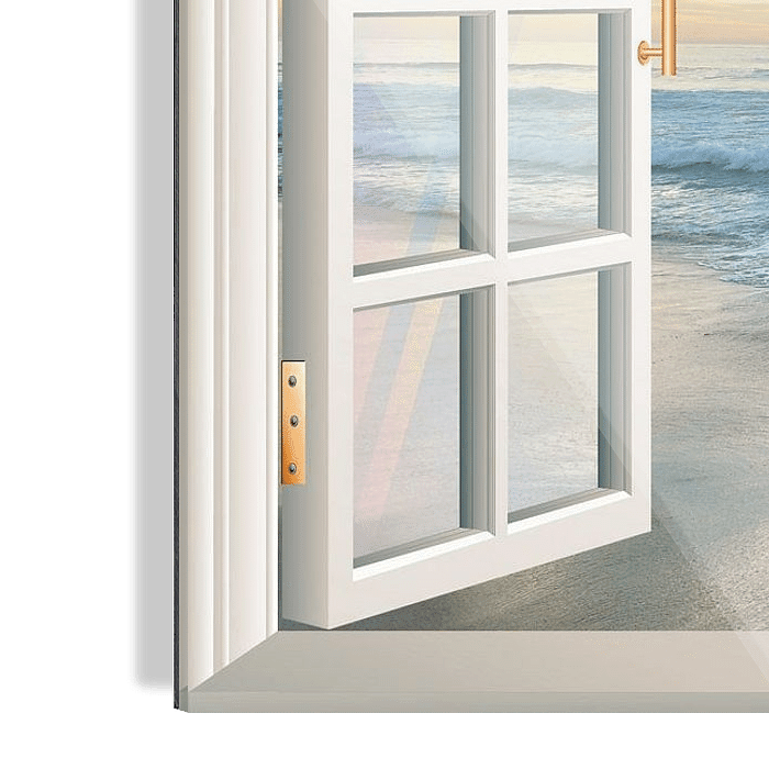 Een prachtig werk van een mooi uitzicht op de zee, vanuit een venster. Het lijkt alsof u levensecht uit het venster kijkt naar een prachtig stukje natuur. Zorgvuldig laag voor laag ontworpen en van zeer hoge kwaliteit.
