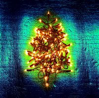 Kerstboom opgebouwd uit een structuur van kerstlichtjes tegen een glimmende gekleurde achtergrond. Laat er licht zijn!