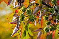 Feestelijk herfstbeeld van een tak van een amberboom (liquidambar styraciflua) met groene stekelige vruchtbolletjes en veelkleurige stervormige bladeren.