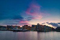 De kleurrijke woningen van de Reitdiep Pierwoningen vanaf de Hoogestraat genomen. Met een deel van de jachthaven en op de achtergrond de ondergaande zon.