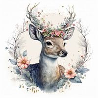 Deze aquarel is een unieke kijk op de natuur, de kop van een hert is afgebeeld met bloemen in zijn gewei. Het hert wordt afgebeeld met een serene uitdrukking, alsof het in harmonie is met de natuur. De bloemen in het gewei voegen een extra laag van poëzie toe aan het beeld. Het is een prachtig beeld van de natuur en haar schoonheid