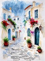 Een aquarel van een smal, geplaveid steegje in een mediterraan dorp. Het stenen pad leidt naar de verte, met de gebouwen die op de achtergrond steeds kleiner en minder gedetailleerd worden. De algehele stijl is schilderachtig en roept een serene, zonnige sfeer op. De belichting is zacht en diffuus, waardoor subtiele schaduwen op de muren en het pad vallen. Het perspectief is vanuit de voorgrond gericht op het steegje, waardoor de blik van de kijker de scène in wordt getrokken. De compositie is evenwichtig, met planten en architectonische elementen gelijkmatig verdeeld, en de focus ligt op de intieme setting. De kleuren zijn gedempt en harmonieus en vullen elkaar aan. De stijl is representatief en legt de texturen van de stenen en planten vast met delicate penseelstreken. De scène lijkt zich in een warm, zonnig klimaat af te spelen.