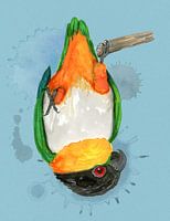 Een aquarel van een zwartkopcaique die ondersteboven aan één poot hangt. Achter de vogel zie je abstracte aquarel vlekken en een blauwe kleur. Zijn losse pootje bungelt er bij alsof hij naar je zwaait.