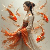een art portret van een jong Aziatisch vrouw met een traditioneel jurk en zwemend oranje koi karpers vissen rondom haar in het water op een zachte lichte wit beige achtergrond.