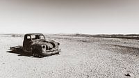 Een autowrak in de woestijn in de buurt van Fish River Canyon, Namibië.
