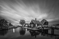 Een Zwart-Wit foto van een avond op de Zaanse Schans, een bekende toeristische hotspot in Zaandijk, in de Nederlandse provincie Noord-Holland, niet ver van Amsterdam.
