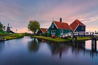 Zonsondergang op de Zaanse Schans, een bekende toeristische hotspot in Zaandijk, in de Nederlandse provincie Noord-Holland, niet ver van Amsterdam.