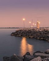 Een verticale 4:5 foto met minimale zachte kleuren van een avond bij van de vuurtoren in Desenzano del Garda, Italië, met uitzicht op het Gardameer en de lichtjes van Sirmione zichtbaar aan de overkant van het water.