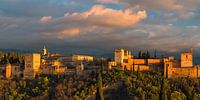 Een zonsondergang bij het Alhambra, een paleis gelegen in de stad Granada, in de regio Andalusië in het zuiden van Spanje. Het Alhambra is een van de beroemdste monumenten van de islamitische architectuur en een van de best bewaarde paleizen van de historische islamitische wereld, naast opmerkelijke voorbeelden van Spaanse renaissance-architectuur.