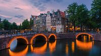 Een zomeravond in het centrum van Amsterdam met uitzicht op het beroemde punt waar de Keizersgracht en Leidsegracht elkaar kruisen met verlichte bruggen en de mooie grachtenpanden.