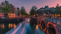 Een rondvaartboot vaart onder de brug door de grachten nabij de Keizersgracht en Leidsegracht in het centrum van Amsterdam, Nederland.