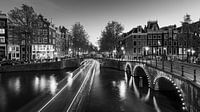 Een zwart-wit foto van een rondvaartboot onder de brug door de grachten nabij de Keizersgracht en Leidsegracht in het centrum van Amsterdam, Nederland.