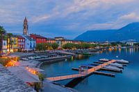 Een foto van een avond na zonsondergang in de stad Ascona, gelegen in het kanton Ticino in het zuiden van Zwitserland, een juweel aan het Lago Maggiore en een waar paradijs met de directe ligging aan het meer met palmbomen, de gekleurde huizen, de mediterrane sfeer en het milde klimaat.