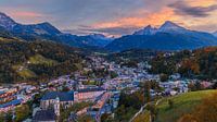 Een 16:9 foto van een zonsondergang in de herfst van Berchtesgaden, een oude stad in het zuidoosten van Beieren, Duitsland, dat gelegen is in het dal van de Berchtesgadener Ache en dat omgeven wordt door hoge bergen.