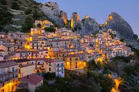 Een avond in Castelmezzano, een pittoresk bergdorpje in de Lucaanse Dolomieten van Basilicata, in de provincie Potenza, zuid-Italië.