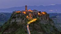 Een 16:9 foto van een avond bij De Civita di Bagnoregio, een afgelegen dorp in de gemeente Bagnoregio in de provincie Viterbo, Lazio, in Midden-Italië.