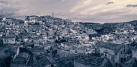 Terwijl het daglicht verdwijnt, licht de oude stad Sassi di Matera op. De stenen huizen en smalle steegjes schitteren zachtjes tegen de avondhemel.