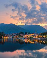 Een verticale 4:5 foto van een avond na zonsondergang in het dorp Mergozzo, een gemeente en liggend aan het Meer van Mergozzo in de Italiaanse provincie Verbano-Cusio-Ossola in de regio Piëmont, noord-Italië.