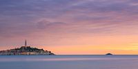 Een 2:1 foto van een zonsondergang in Rovinj, een stad in Kroatië gelegen aan de Noord-Adriatische Zee.