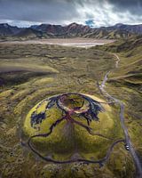 Dit is een foto van een kleine vulkaan in de hooglanden van Ijsland. Op de foto zie je twee terreinwagens staan om je een idee van de grootte van de vulkaan. De foto is gemaakt met een drone