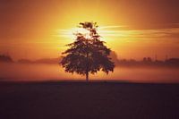 De opgaande zon in Zwevegem creëert een mooi silhouet van deze boom. In combinatie met de mist zorgt het diffuus licht voor een dromerig sfeertje en een mooi warm contrast op je muur.