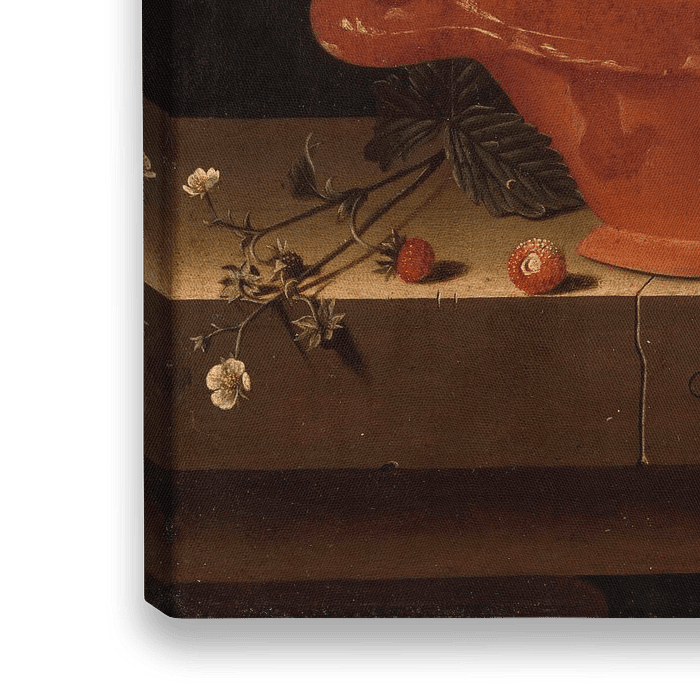 Een bakje aardbeien op een stenen plint, Adriaen Coorte, 1696