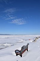 Een bankje op het dok in de winter, Montmagny, Québec, Canada