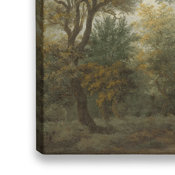 Koop Een bebost landschap met figuren, Meindert Hobbema als reproductie op canvas, aluminium dibond, (ingelijste) fotoprint, behang en ArtFrame, op maat geprint in Fine-Art kwaliteit.