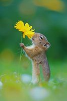 Een klein knaagdier staat midden in een bloeiende weide en staart teder naar een felgele bloem. Zijn nieuwsgierige blik en rechtopstaande voorpoten geven hem een charmante, bijna bewonderende uitdrukking. De zachte achtergrond en warme kleurtonen creëren een harmonieuze sfeer die het delicate scenario perfect onderstreept.