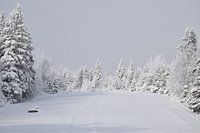 Een besneeuwd bos tijdens de storm, Sainte-Apolline, Québec, Canada